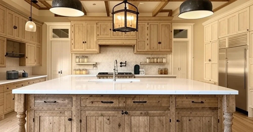 - Inspiration: Install a reclaimed wood island with a white quartz countertop and vintage-inspired pendant lights.